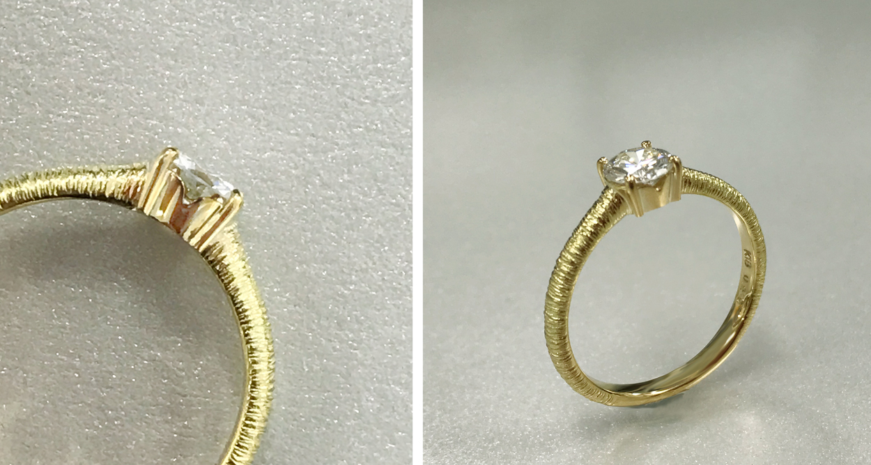 ヘアライン状の表面加工をあしらったダイヤモンドリング