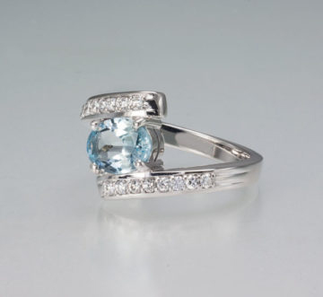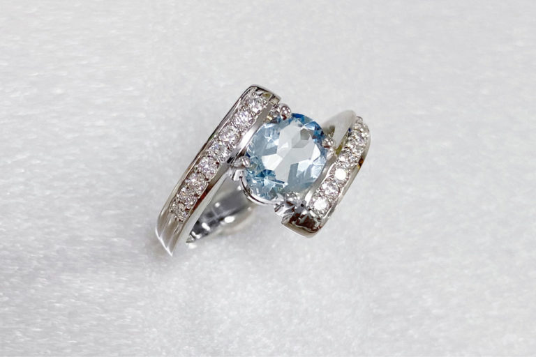 センターにはアクアマリンを4本爪の石座で丁寧にセッティングし、側面を窓抜きにすることで、石本来のクリアな煌めきを最大限に引き出しました。