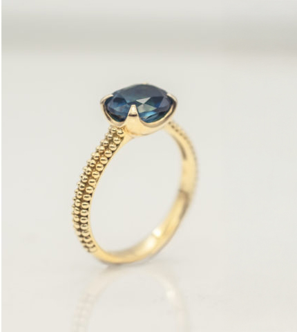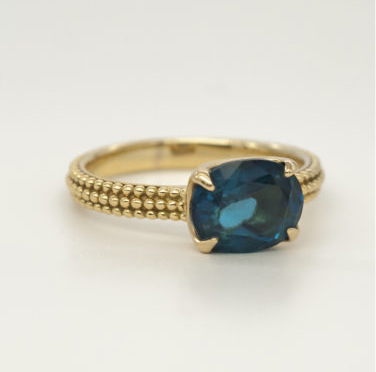 K18イエローゴールドの柔らかな質感が、ロンドンブルートパーズの深い青を引き立て、肌馴染みの良い日常使いしやすいリングに仕上がりました。