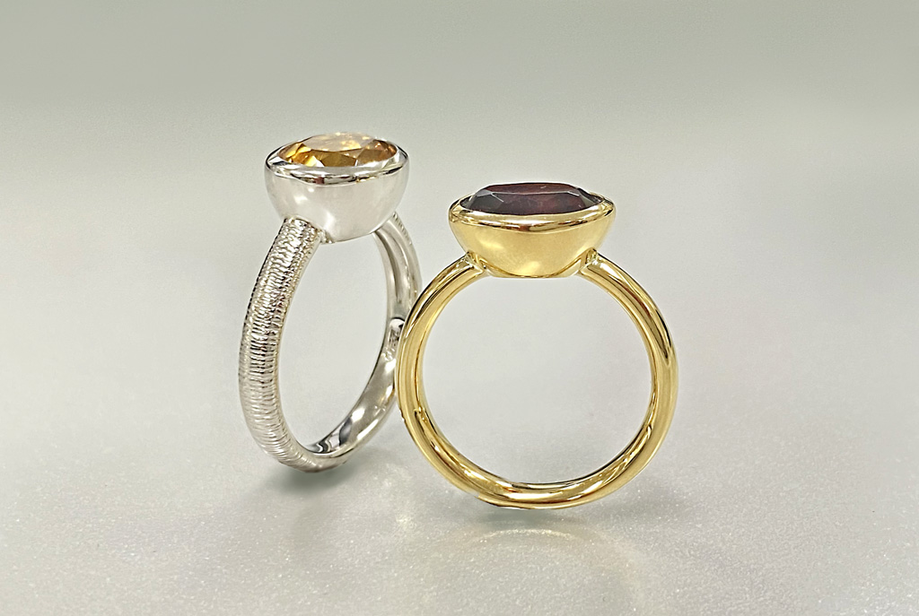 深みのある赤色が魅力のガーネットはK18で、明るいイエローのシトリンはPt900にヘアライン状のテクスチャーをあしらいました。