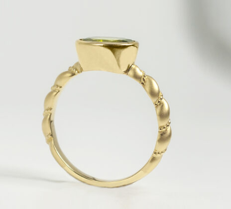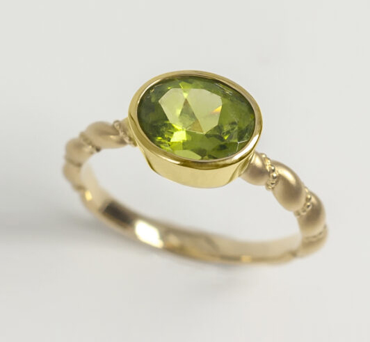 K18YGで仕立てることで、ペリドットの鮮やかなオリーブグリーンがみずみずしく際立ちます。