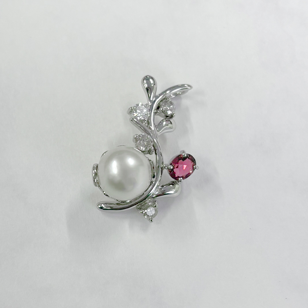 しなやかな曲線に沿うようにパールをセッティングし、葉のデザインに設けたくぼみ部分には赤石とダイヤモンドをあしらいました。