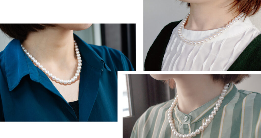 襟首のやや詰まったTシャツに着けるとバランスが良く、襟首が広めのTシャツの下に着けるとさりげないパール使いに大人の余裕すら漂います。