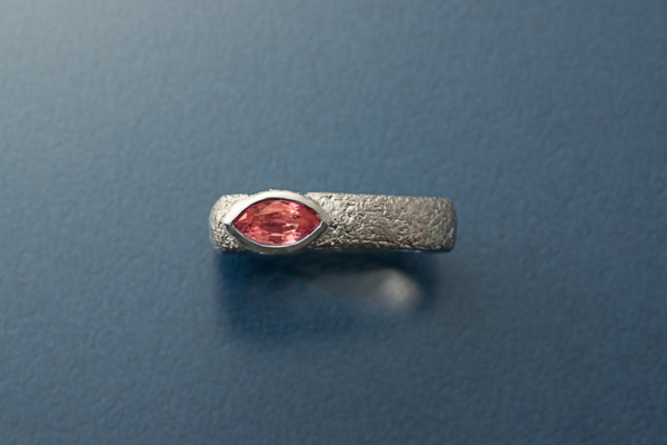 中石になるパパラチアは美しいカラーを引き立たせる為に石の周囲を鏡面にし、片側に寄せてアシンメトリーに配置。