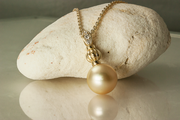 K18YGを使用することでシャンパンゴールドの南洋真珠の持つ やわらかな光沢を品良く引き立てました。