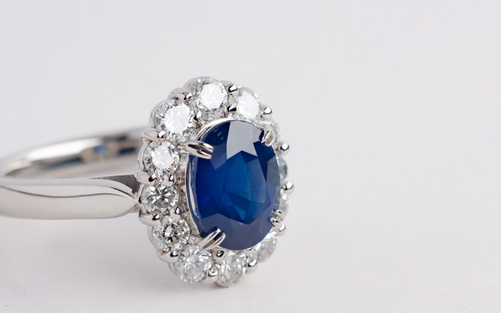 14pcsのダイヤモンドのうち12pcsを使って中石であるサファイアの深いブルーを引き立てるクラシカルな取り巻きスタイル。