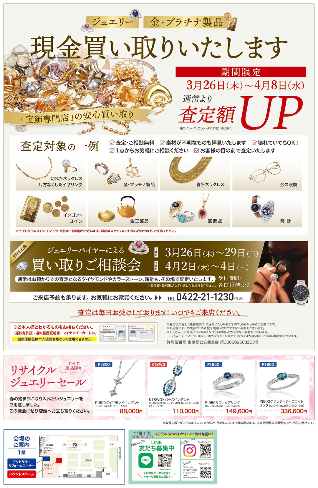 また、3月26日(木)~4月8日(水)の期間中はいつでも、金・プラチナ製品の査定額を通常より10%UPにて現金買い取りいたします。