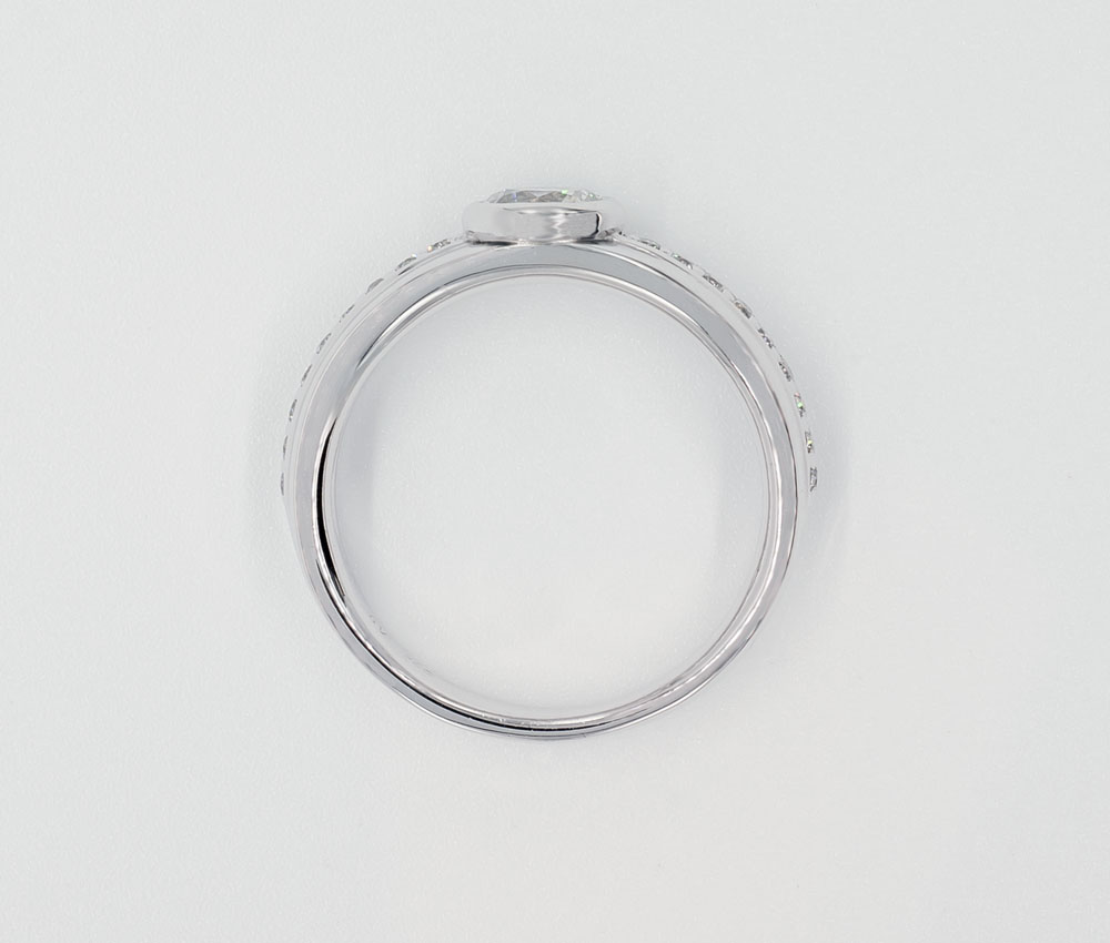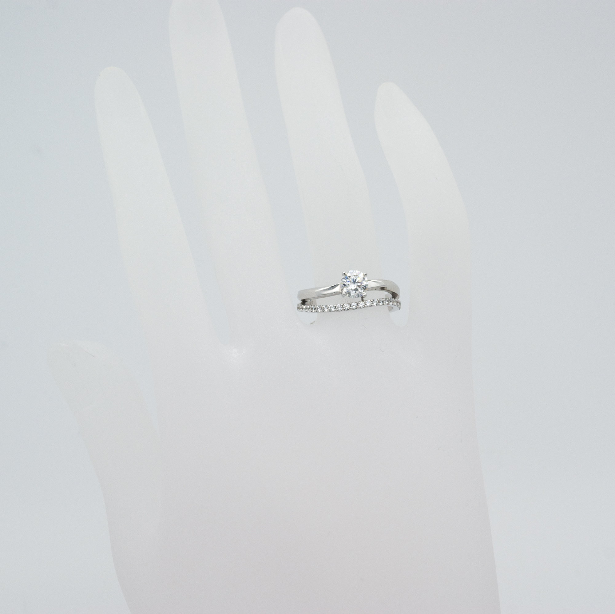 シンプルな一粒ダイヤのリングと、繊細なメレダイヤのリングを重ね着けしたような優しいイメージのデザインです。