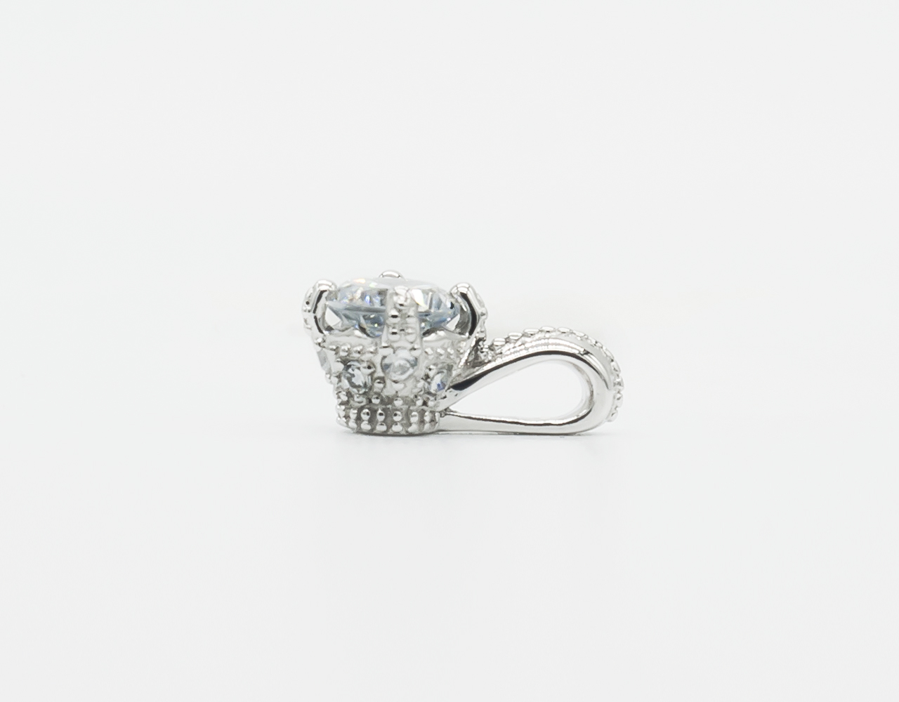 センターストーンの石座側面はクラウンのようにメレダイヤをセットし、爪とバチカン部分はミル打ち風のデザインでクラシカルな印象を与えます。