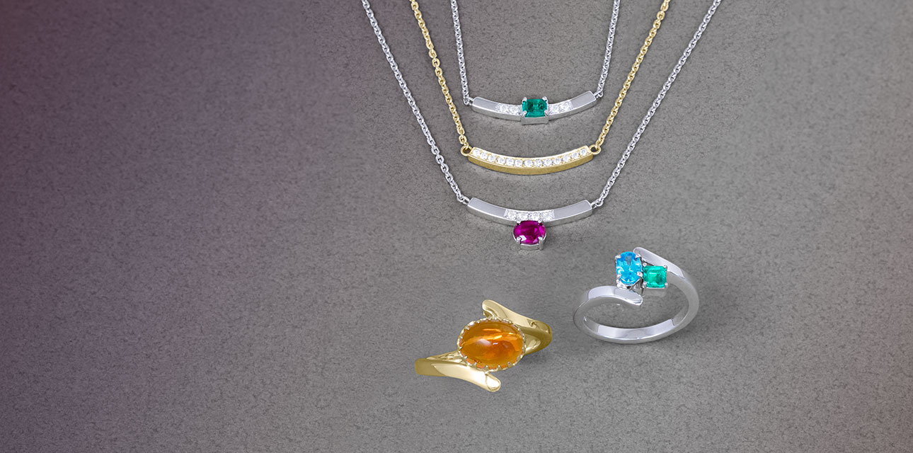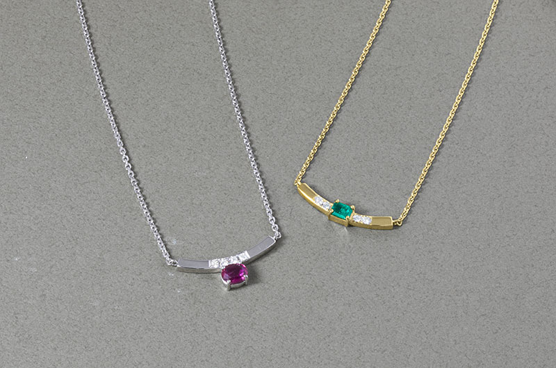 ネックレスはチェーンとの接点を左右に分散させることで、着用時の安定感と美しい収まりを実現しており、リングは軽やかなアームが中石の煌めきを引き立てます。