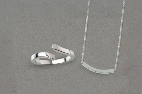 両づり構造の緩やかな曲線が特徴のネックレスリフォーム枠と、流線形のアームが特徴のリングリフォーム枠。
